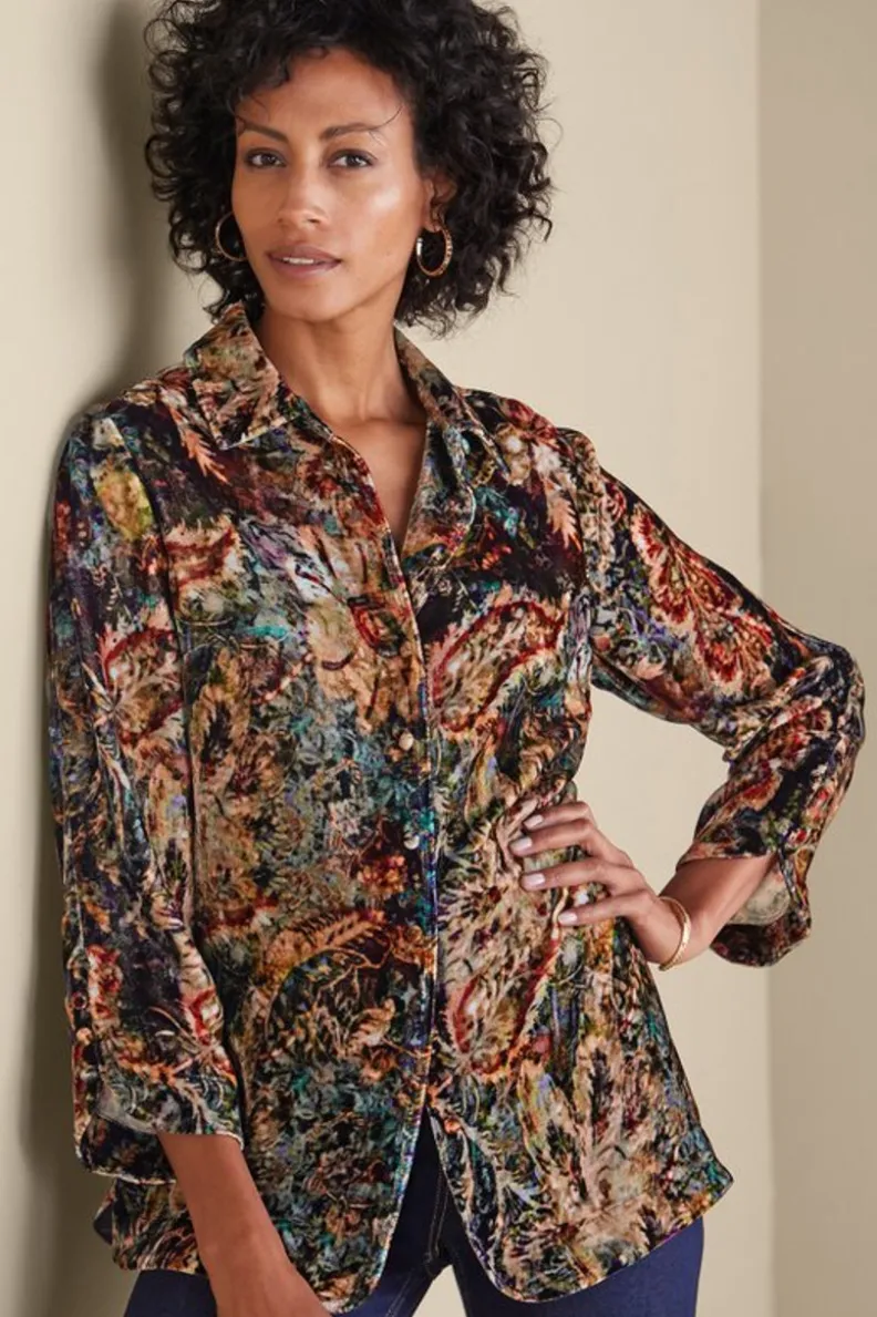 Lavish the hours in our lush and silky velvet blouson, with curved openings at full front placket and button-detailed 3/4 sleeve openings, bust darts, and side-slit hem.