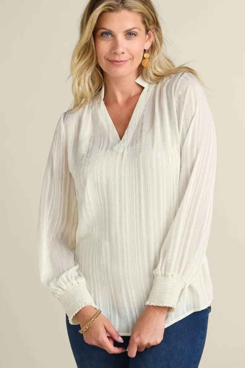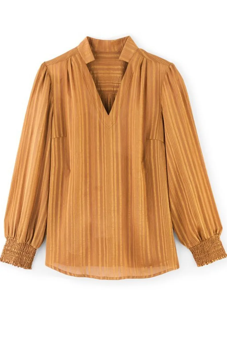 This crinkly top glistens with tonal vertical stripes stealing the spotlight. The cut is so modern, featuring pleat details at the shoulders and back yoke seam. Finished with a petite ruffle, the long sleeves are elasticized to push up as you please.