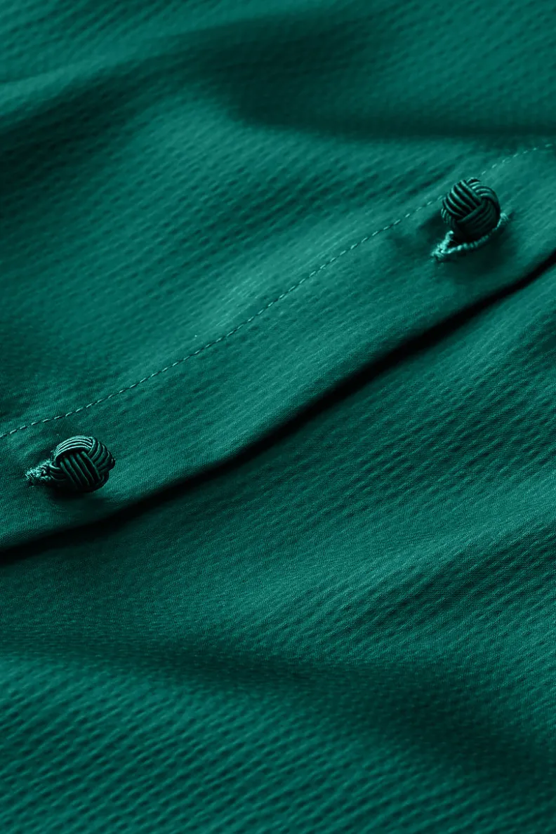 Indulgently smooth in textured satin, the jewel tone sheen adds elegance to this boyfriend tunic. The French knot button front flows into an always-flattering curved shirttail hem and effortlessly dresses up any outfit.