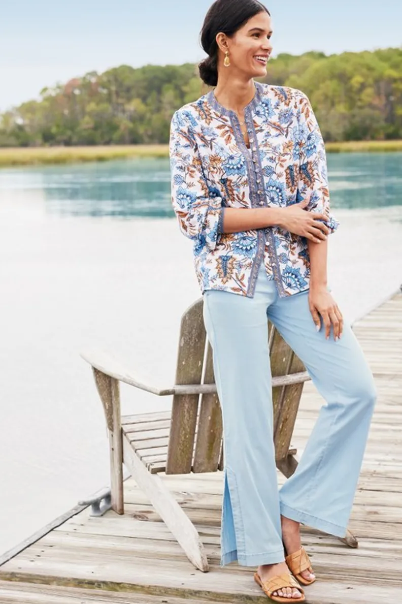 Wear this lightweight top through the warmer months with flowy pants and sandals, then take it into fall with jeans and boots. Printed in shades of blue and copper, it’s finished with a contrasting paisley border at the placket, collar, and cuffs. Shirring at the sleeve cap adds volume for a subtle puff silhouette. Open Mandarin collar with fully functional center button placket below the V-neckline.