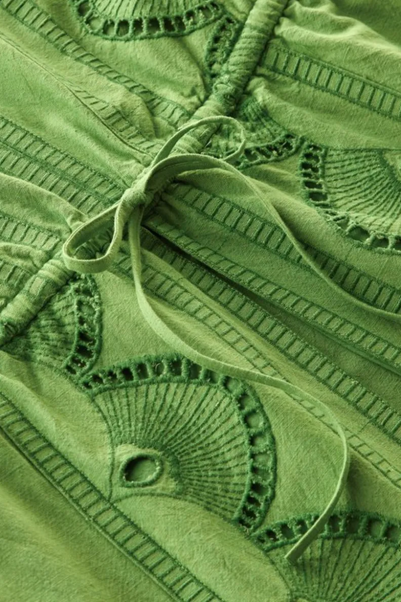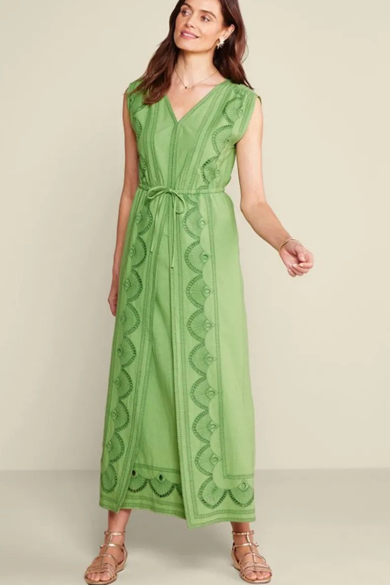 Look like a dream in green. Lightweight and airy, the linen blend Ellison is quite possibly the perfect summer dress. A V-neck flatters, while a comfy elastic waist ties to give shape. The paneled skirt adds movement and definition, and the allover eyelet embroidery adds texture and detail. Perfect for tropical getaways or summer stay-cays!