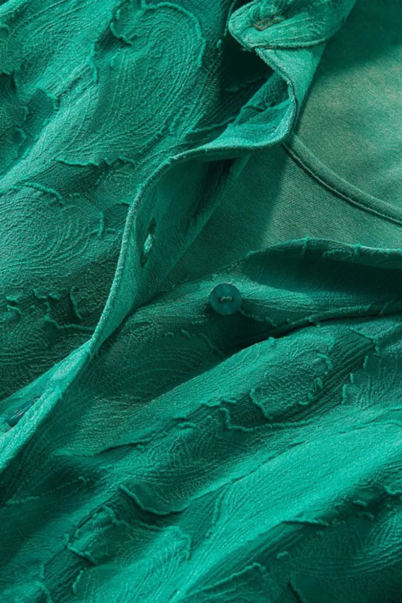 Give it a scroll. This sheer delight features printed jacquard that’s oh-so-soft and luxe. The collared, button-front tunic even comes with a matching knit tank, so you don’t have to worry about unnecessary show-through. Button cuff long sleeves.