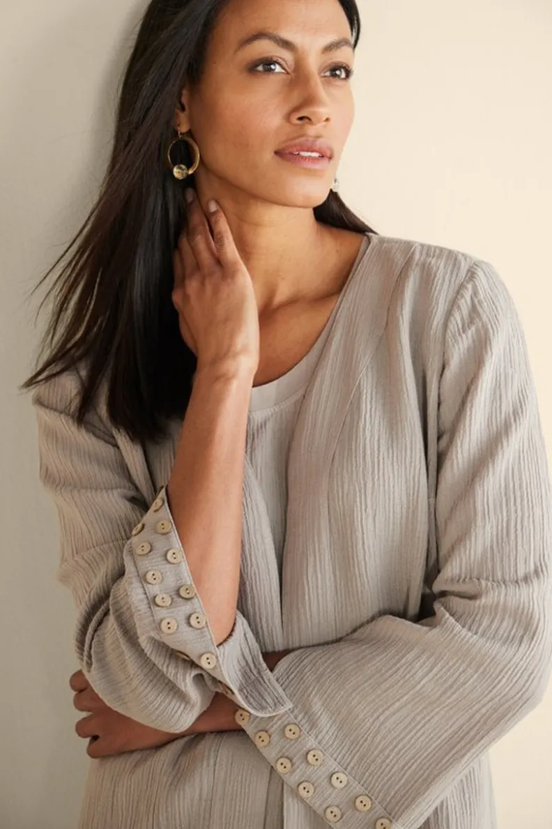 Breathable with a luxe drape, our lightweight Oceo Gauze has a naturally crinkled texture. Mix, match and pack no ironing needed. Open front, side slits and button accents on bracelet-length sleeves. P.S. Also comes in a tank, tunic and wide-leg pants!