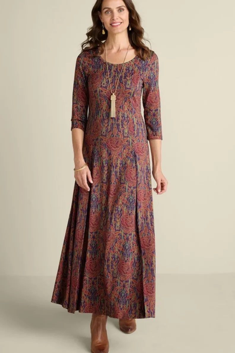 Artistic roses electrify your must-have maxi-dress for an instant chic look. Princess seams give it great shape. 3/4-length sleeves, scoop neck, back zip.