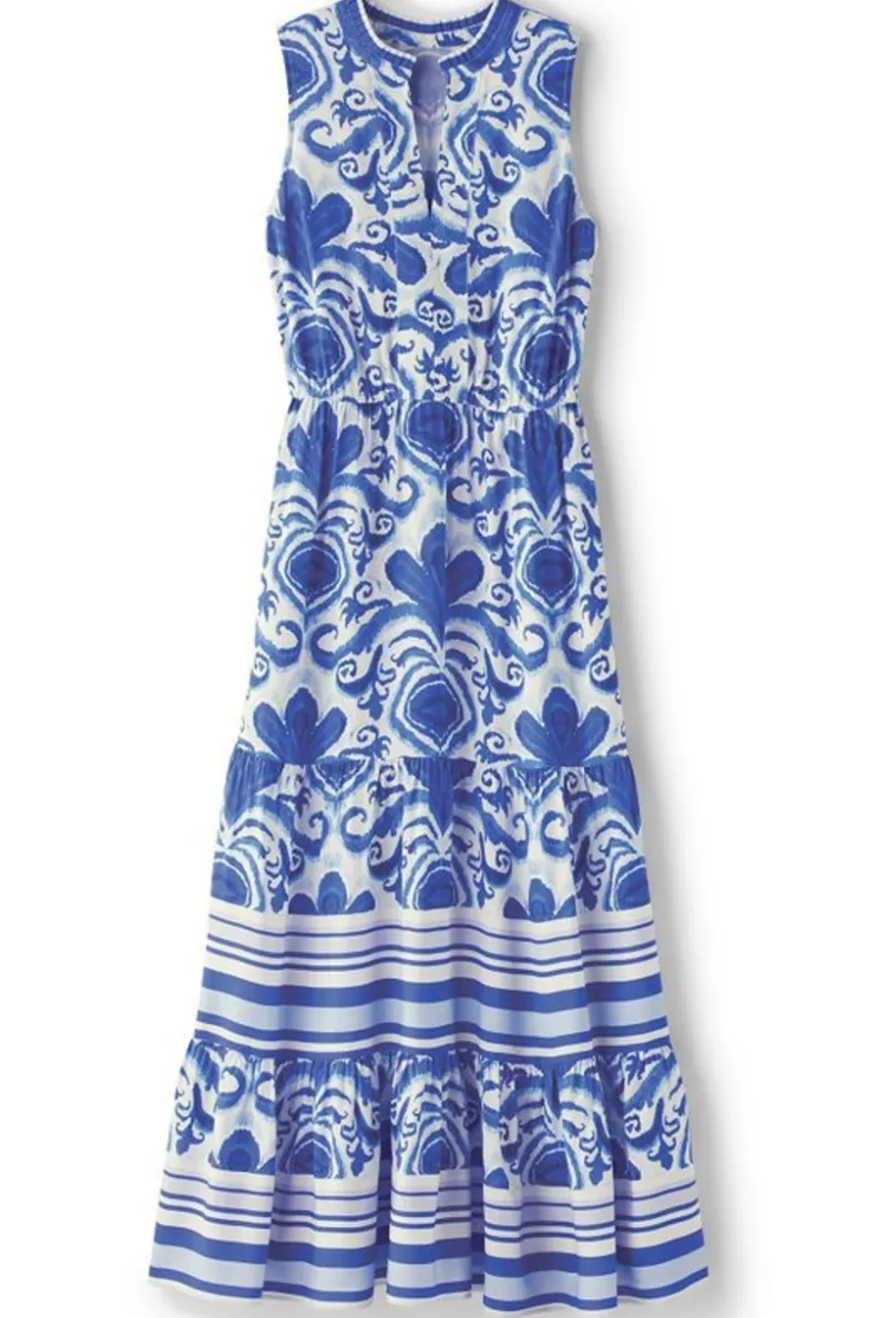 A sleeveless maxi is a summer necessity. One with feminine frill and a print that really pops? Just an added bonus. This tiered beauty features a fun ruffle-trim collar that leads into a split neckline. The elastic waist makes it easy to wear and thanks to the pockets, you can carry small essentials with you wherever. Pining for more of this print? It’s in a tunic, too! (2GJ71). Misses 53 in long.