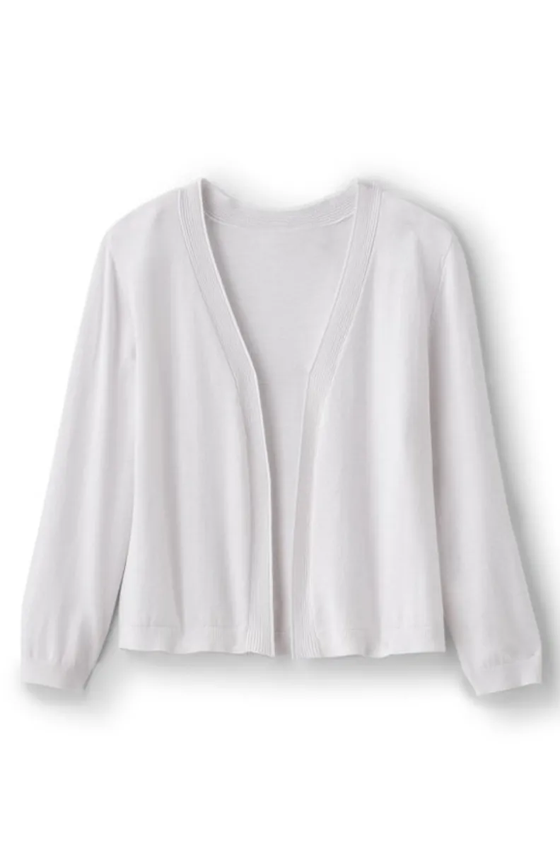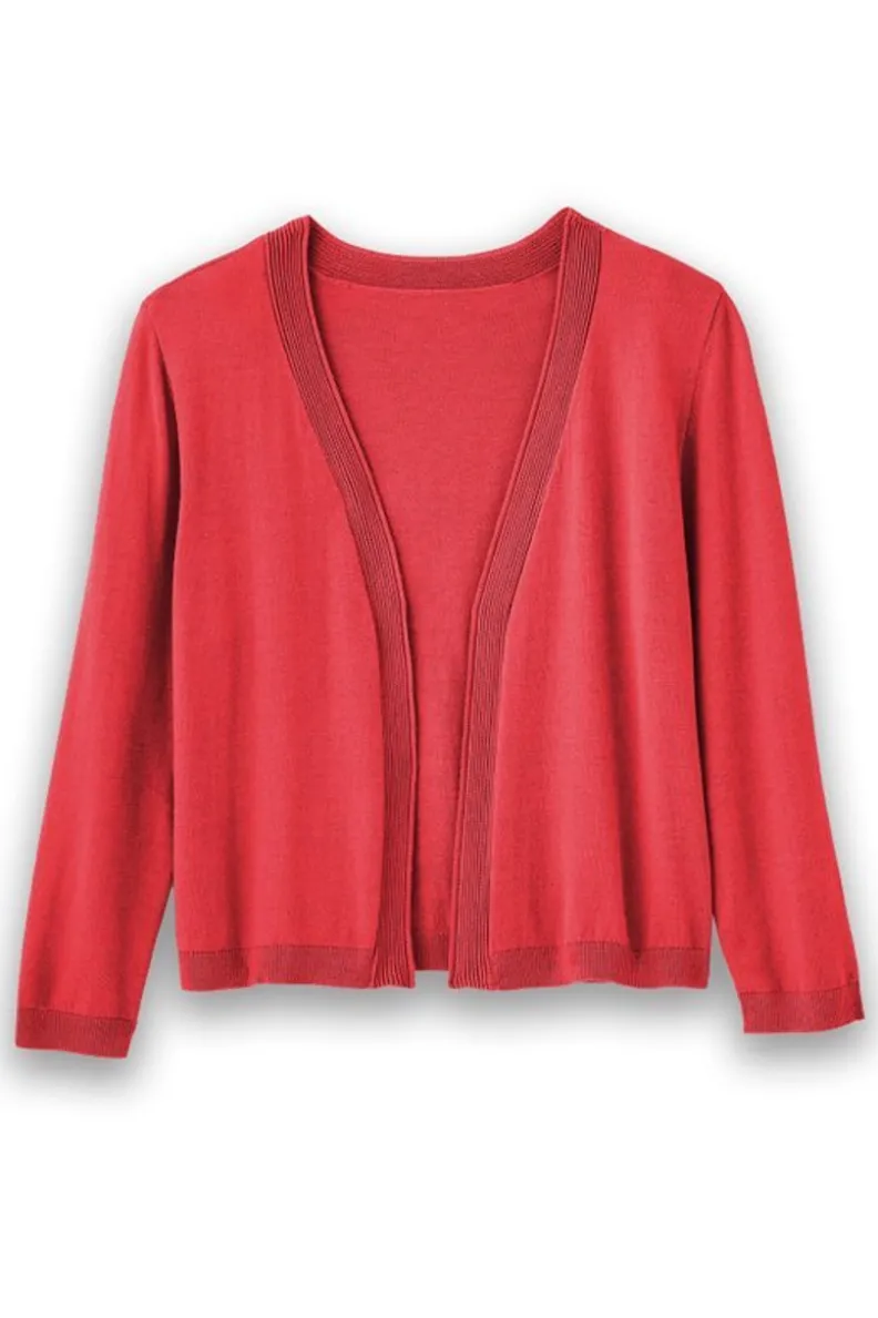 Everyone needs a classic cropped cardi in their closet and this should be the one. This 3/4-length sleeve style features an open-front design with decorative ottoman stitching at the placket. The perfect cardi to wear over dresses and pair with skirts, too.