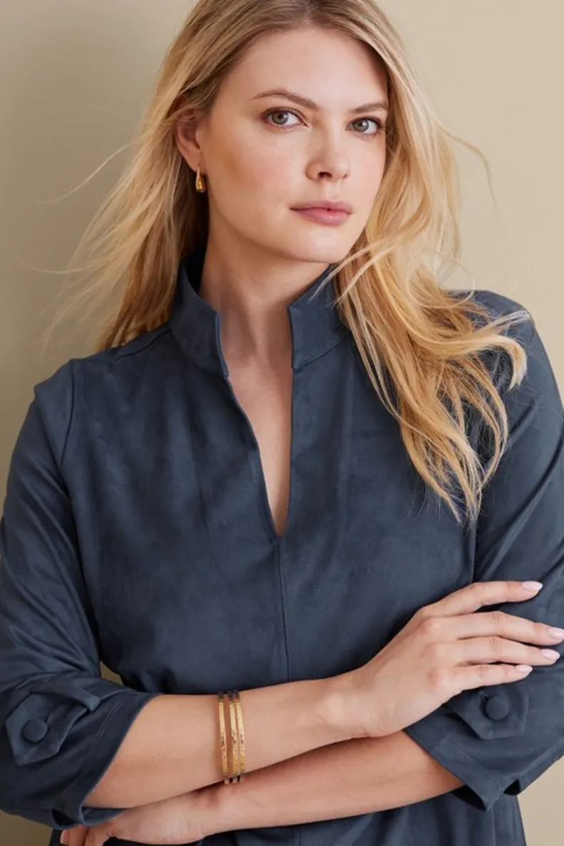 The light sheen of suede is a luxe style statement for fall. Our stretch vegan suede is designed to feel amazing against your skin, so buttery soft and lightweight. This chic shift dress offers a modern look that flatters every figure with a collared split V-neck and swingy fit.