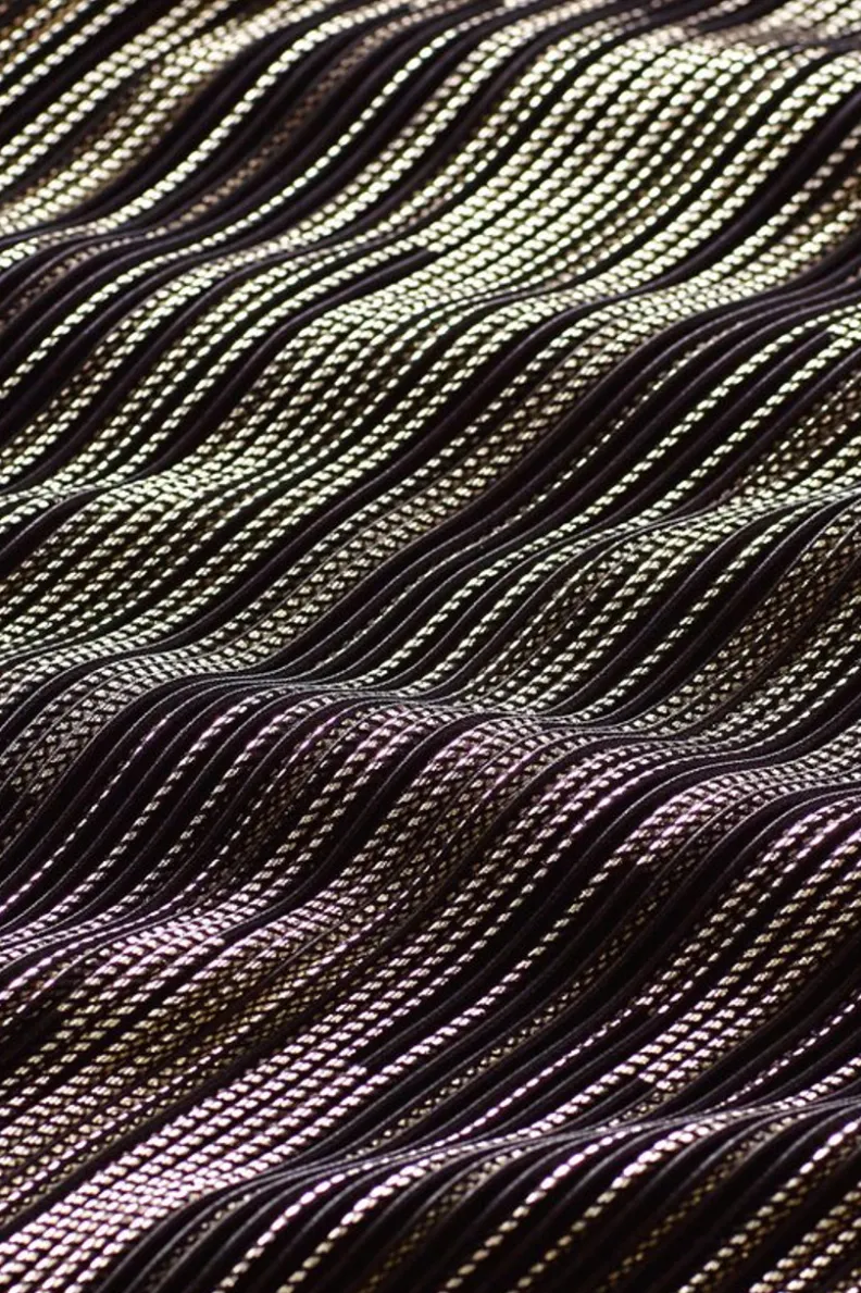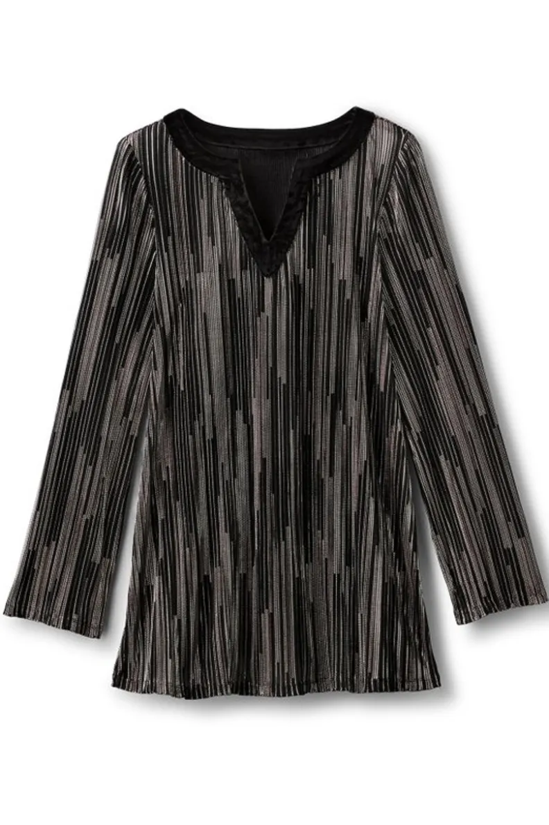 Dripping in metallics and a kiss of velvet, all eyes will be on you in this crinkled plisse tunic. It’s free-flowing drape endlessly flatters and its black and gold palette shines brightest when matched with rich black pants.