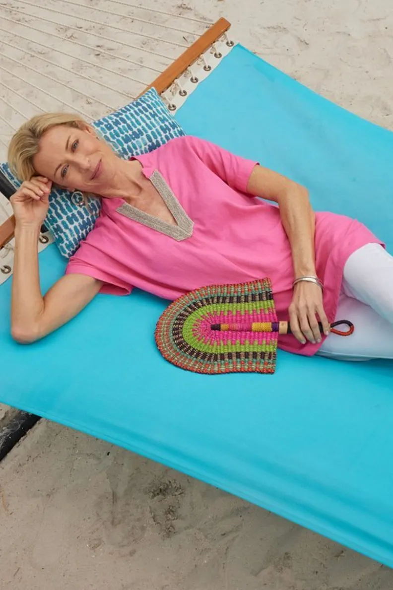 This pretty-in-pink tunic is everything we love about the sunny season. The lightweight linen blend catches the breeze and drapes like a dream , while the island-bright hue makes for an instant mood boost. Cuffed dolman sleeves keep you cool, and side slits add extra movement, too. Finished with a mandarin collar and split neck with metallic beadwork, it’s a relaxed-yet-refined look that can be dressed up and down with ease.