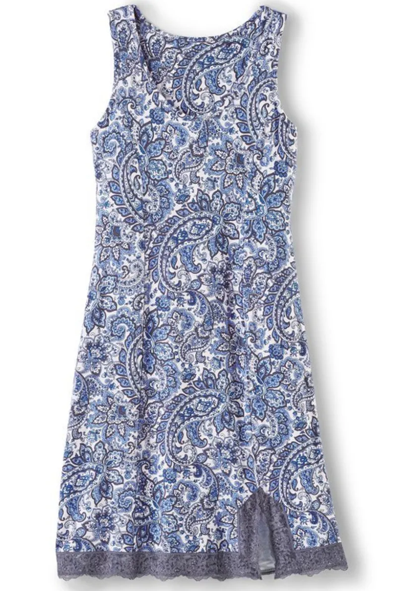 Dreamy soft and lightweight, bamboo viscose jersey will keep you feeling cool, for your comfiest night’s sleep. This sleeveless pullover sleep dress comes with a built-in shelf bra and lovely lace trim, too. Sweet dreams!