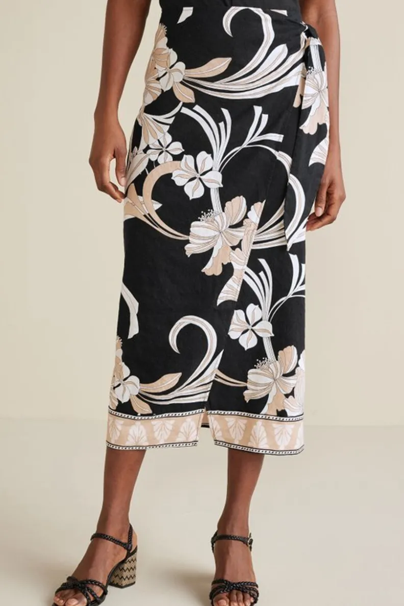 Flow effortlessly from sunrise to sunset and casual to formal in a linen blend that actually moves with you. Isla Stretch Linen has the texture and airiness of classic linen with an elegant drape and easy stretch that takes you where you want to go. This faux sarong wrap skirt has a center back zipper for easy on and off, waist tie and a print that pops no matter where you wear it. Shaping back darts. Available in a midi dress and slim-leg pants, too!