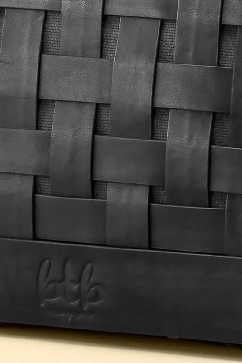 Bands of leather weave textural contrast into the essential black canvas clutch. Sleek and monochromatic with a handy wrist strap, this design is generously sized to tote all the necessities. Zip top. Lining. Pockets.