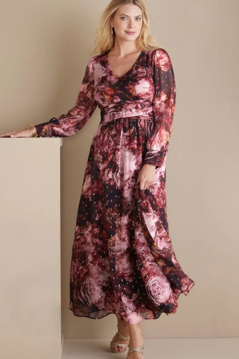 Painterly blooms in shades of rose and cabernet are gilded with shimmering details on this light and flowy silk dress. With sheer, button-cuff sleeves, its utterly feminine and luxe. Polyester crepe lining, invisible side zip.