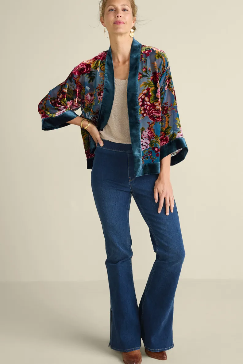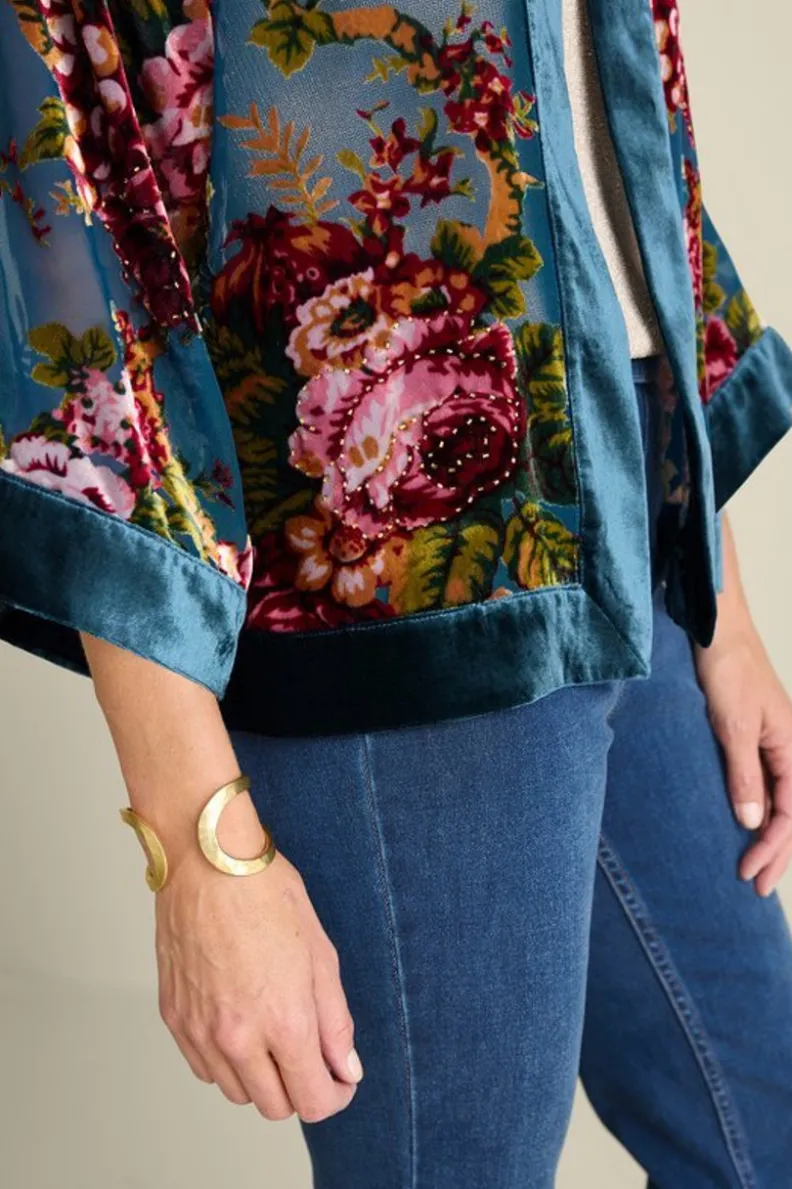 A topper is a great go-to when you need a luxe lightweight layer. Like the sheer romance in this floral velvet burnout style sprinkled with beadwork. It drapes like a dream with its open front and drop shoulder 3/4 sleeves. Trimmed in rich velvet, it’s one you’ll reach for attending and hosting soirees.