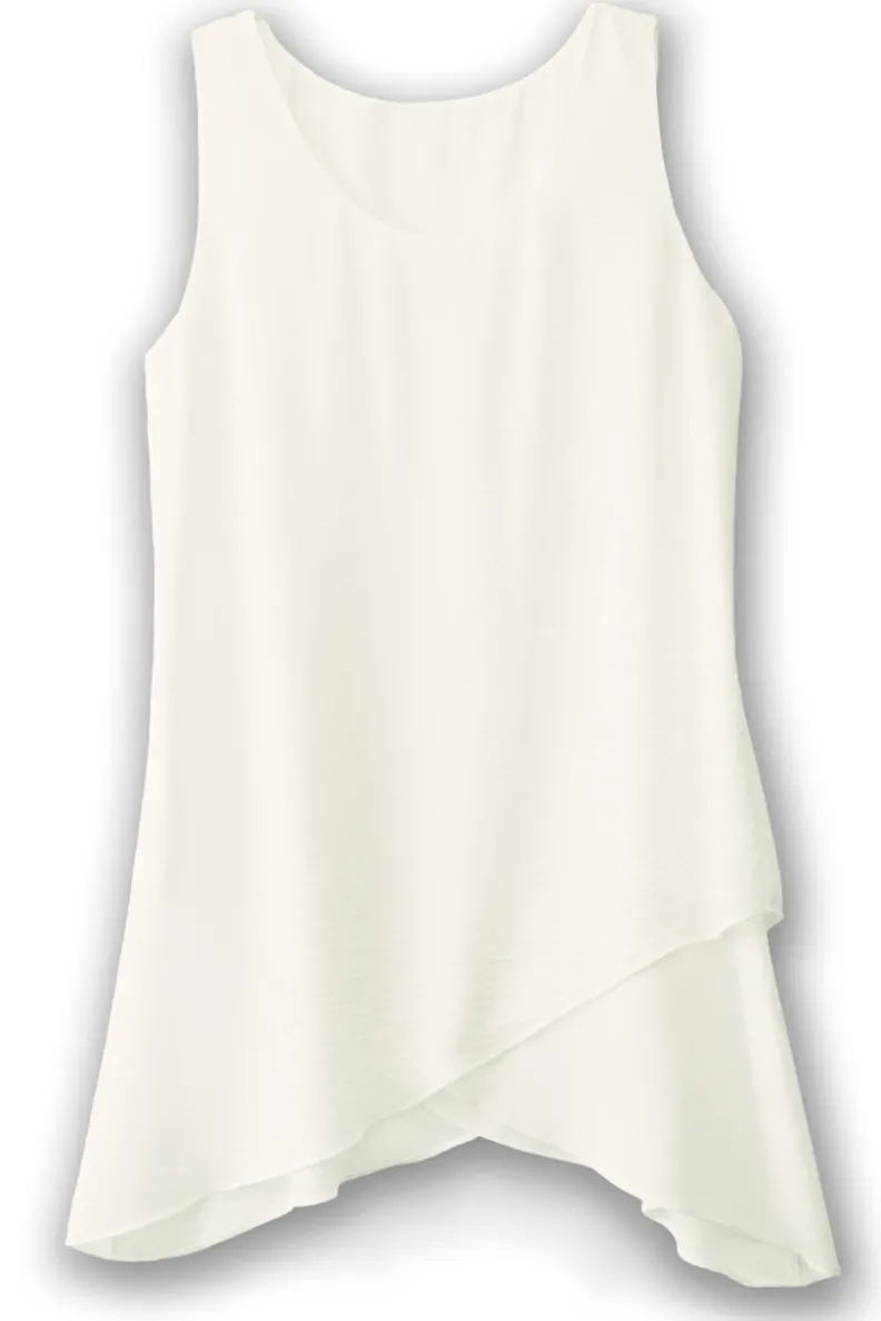A new angle on the must-have tank finds swingy asymmetrical layers criss-crossing with irresistible flair. Scoop neck.