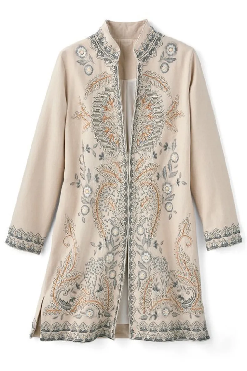 Shift your neutrals into overdrive with lavish, and we mean LAVISH embellishment. This 360 stunner is detailed with thousands of stitches, decorative cording and petite beads on every side and seam. The weighty cotton twill is a natural selection for the early days of spring, but it’s so exquisite, you’ll want to wear it year-round (and you can!). Dress it up with pants and heels or take it casual-cool with a tank and jeans. It’s a confident, chic look no matter how you style it. Fully lined with a contrasting silky tonal floral print. Mandarin collar, long sleeves. Single hook-and-eye closure at center front. Side slits.