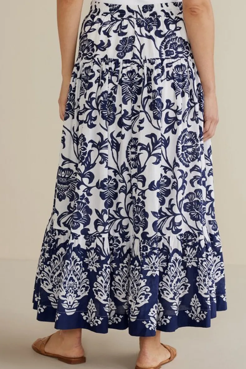 Put it in neutral with this perfectly printed tiered maxi skirt. A soft and comfortable drapey cotton blend, an easy back elastic waistband, plus pockets, too! Dress it up with a blouse and heels or dress it down with a tee and sandals. Also in a matching top to wear as a set! 2GJ14