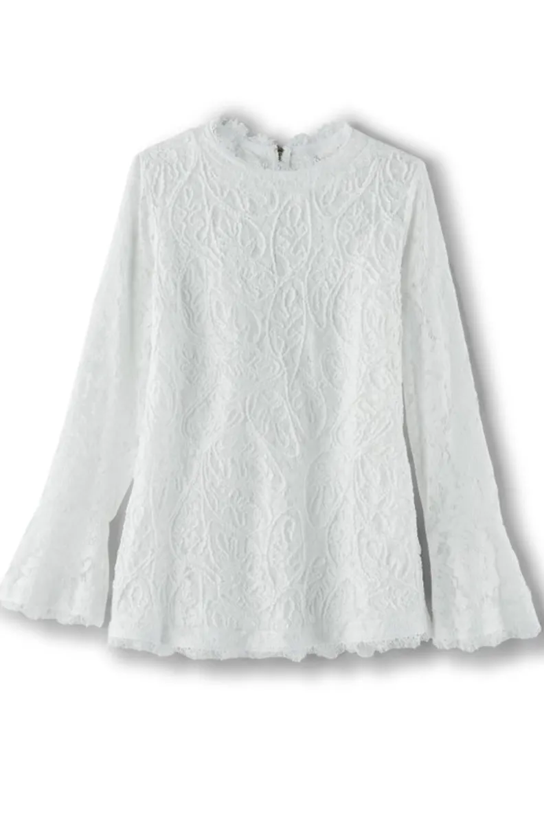 An intricate soutache design delicately details this romantic lace top. A scalloped eyelash lace trim at the neck, hem and bell sleeves adds to the feminine flourish. Back zipper and lined body – no cami required.