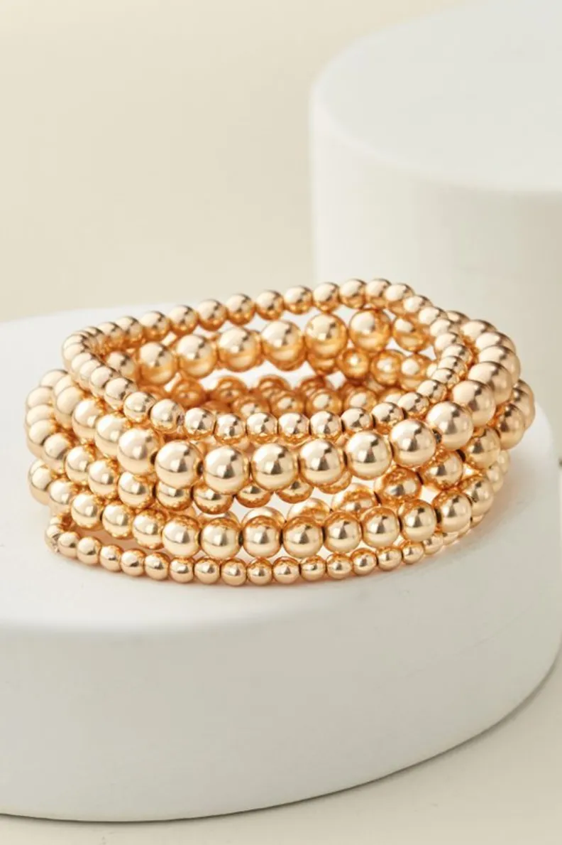 This shiny set of six is all about versatility! This beaded bunch will never go out of style because they’re effortlessly stunning, plus the striking silver or gilded gold match back to countless outfits. Wear all six together or even just one or two at a time there are so many reasons to love this simple yet swank stretchy design.