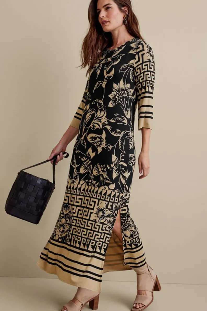 The interplay of big, splashy blooms and a geometric, Greek key design create a striking visual that’s maxi perfect for entertaining or a night out. 3/4 sleeves bell ever so slightly. Straight cut with deep side slits. Variations in floral and geometric placement will occur making each dress unique.