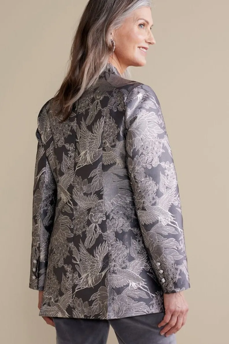 Exquisitely patterned in shades of platinum and silver, this finely tailored jacket makes a sophisticated layer for day and evening alike. Princess seams and a built-up collar create an elevated silhouette, while a single frog closure cinches the waist. Side seam pockets. Fully lined.