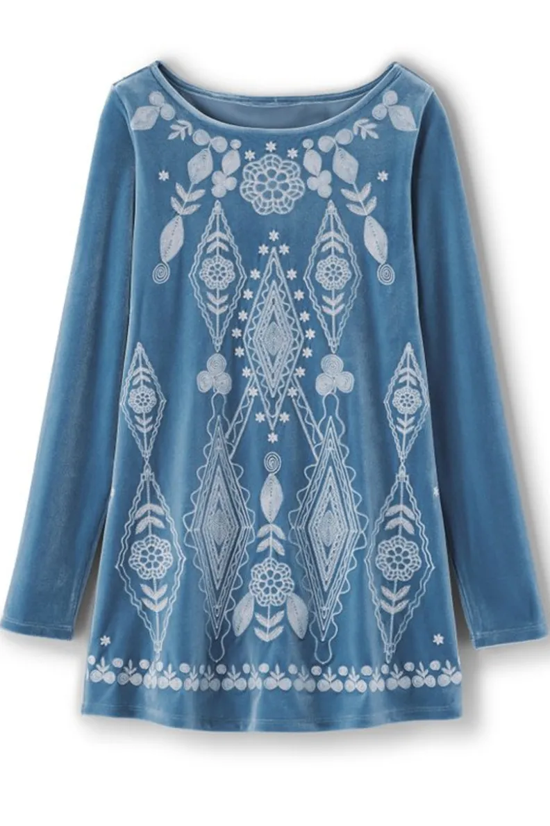 New Soft Surroundings Nori Embroidered Velvet Tunic MoonlightBlue