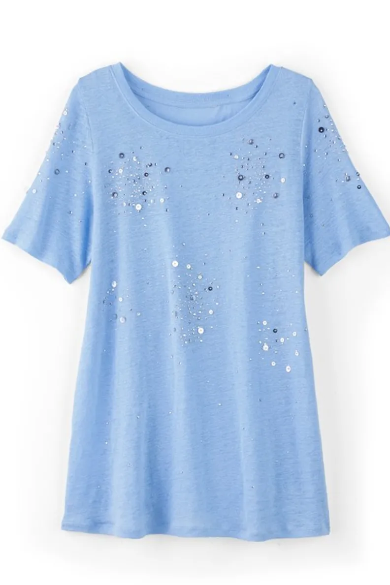 Linen is magic for lightweight, breezy comfort on steamy summer days. This linen knit tee gives you the cool, moisture-wicking feel you love from the classic fabric, plus a touch of sparkle from shimmering beading and sequins. Scoop neck, short sleeves.