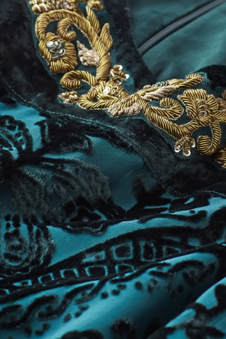 Host and toast the holidays in luxury with double the dose of lush velvet. It has crushed velvet sleeves, a burnout velvet body and the grandest zardozi “necklace” for an all-in-one flattering silhouette. Princess seams elongate the body. Fully lined with back zipper for easy on and off.