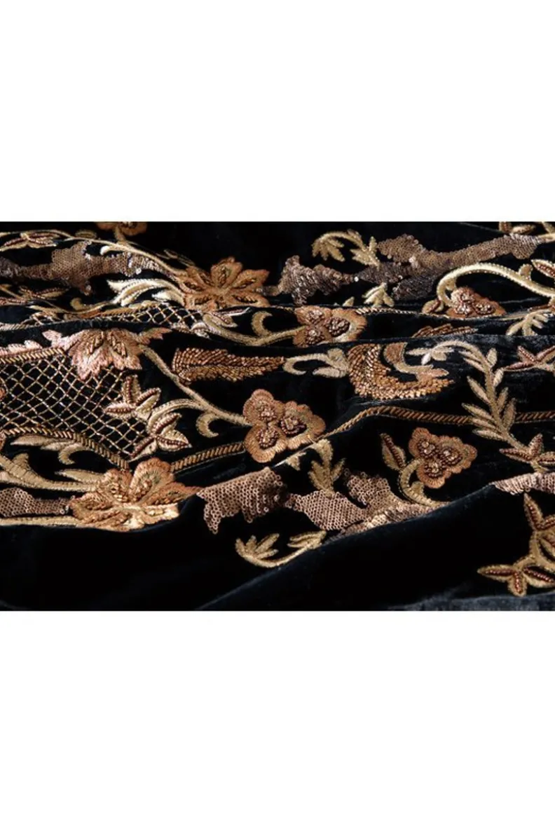 Elegance is easy in this luxe black velvet jacket embellished with rich embroidery in front and back. Designed so every detail feels just right, from the face-framing stand collar to the sparkle at the sleeve hems. Full jacquard lining. Hook-and-eye closure.