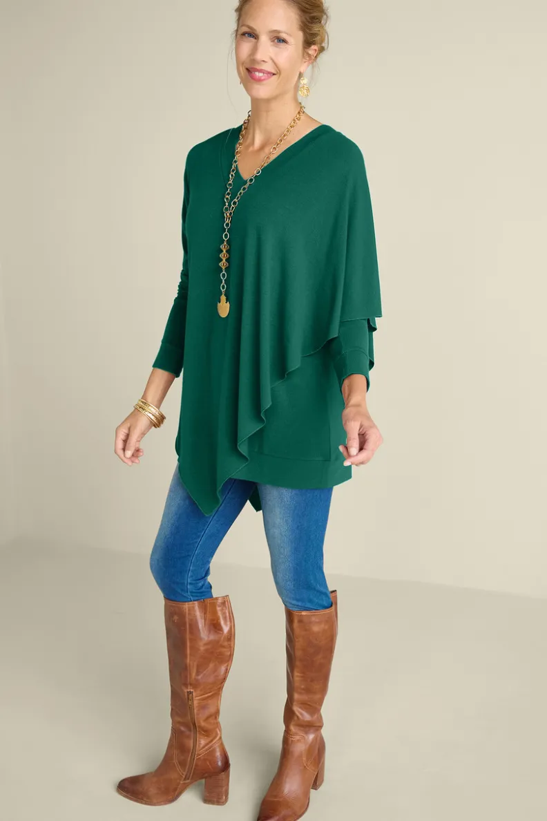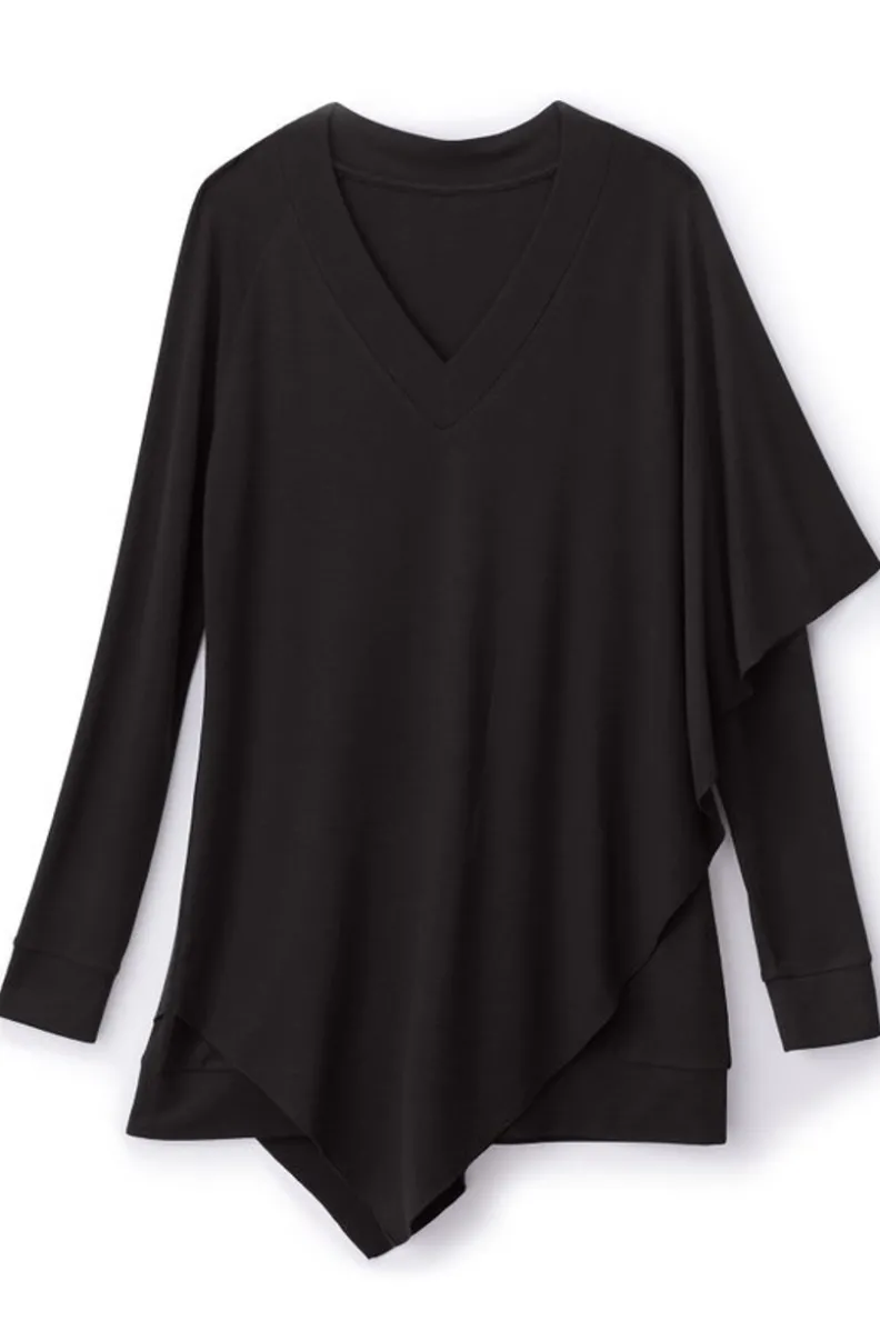 An easy-elegant tunic with cape-like overlay on one side, V-neck and raglan sleeves.