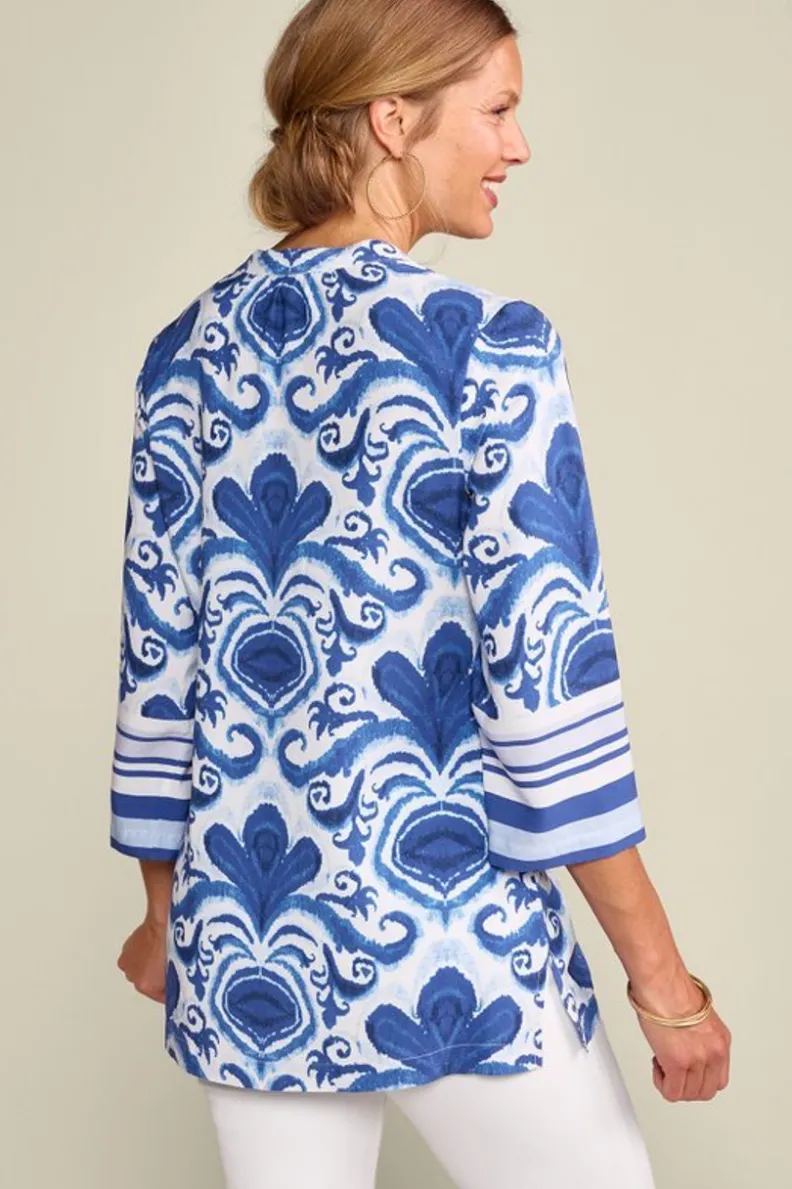 Let’s talk tunics. The longer length makes them great, but this one truly stands out with that dynamic print. The border print at the drapey 3/4-length sleeves is the perfect contrast, too. Can’t get enough of this print? You’re in luck because it’s even in a maxi dress (2GH39).