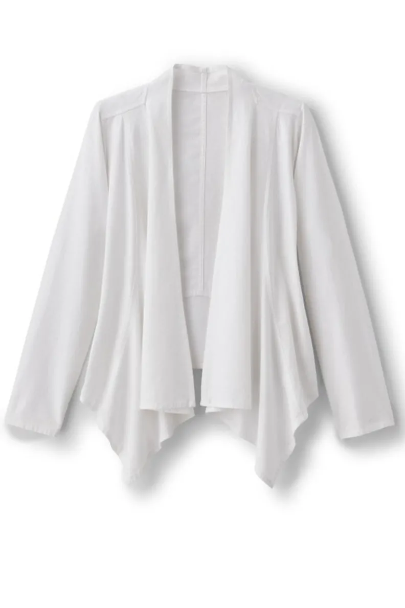At ease in a comfortable linen blend fabric, this topper is an essential for breezy days and cool evenings. Designed with a drapey front with princess seams to create a shapely silhouette, and hem tabs at the back waist that allow you to add more definition if desired.