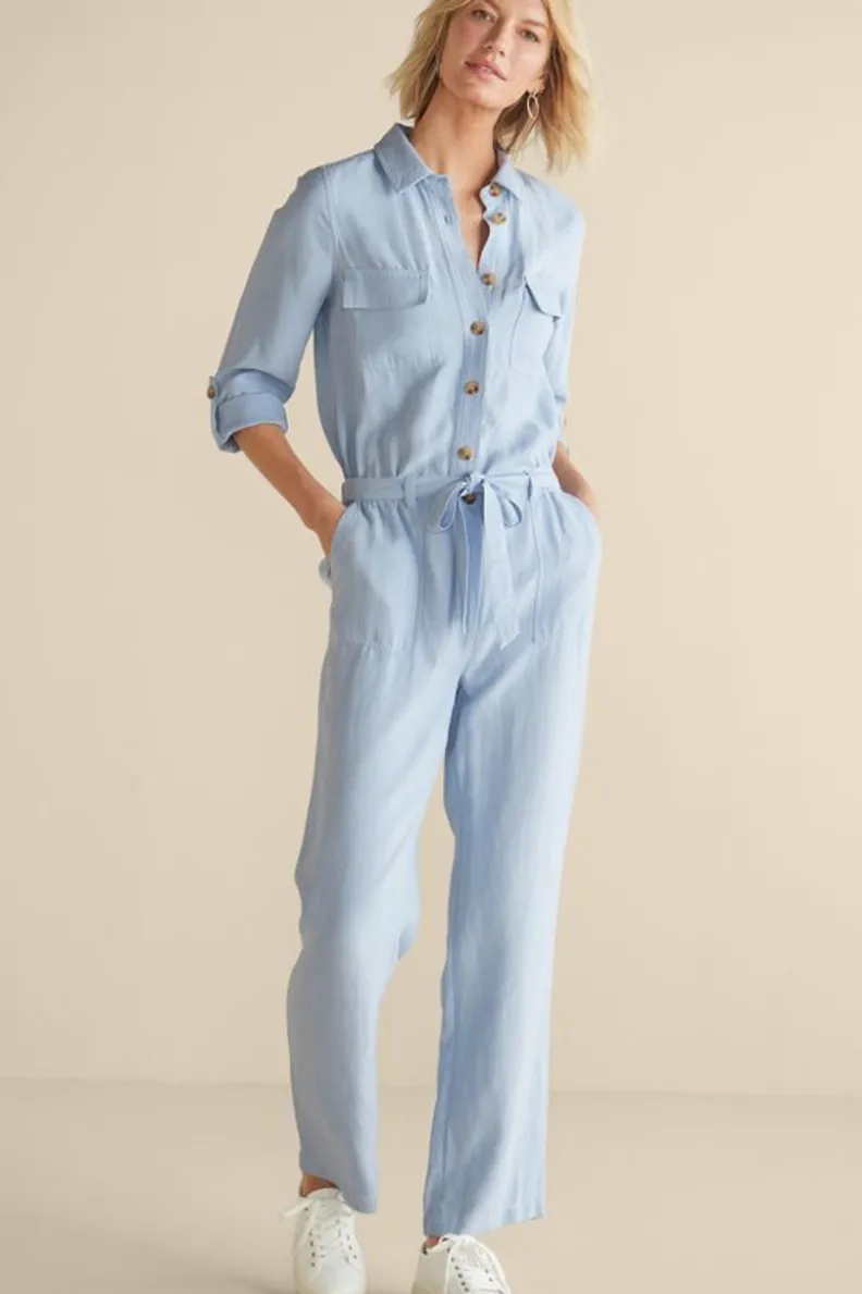 Pulled together in an instant, a stylish jumpsuit solves the question of what to wear in one easy step. Our chic rendition starts with a soft and drapey blend of lyocell and linen, the perfect weight to keep you cool as the temps warm. We’re simply wild about the safari accents: chest flap pockets, long roll-tab sleeves, self-tie belt and faux tortoise buttons. Front and back pockets. Elastic waist with button/zip fly.
