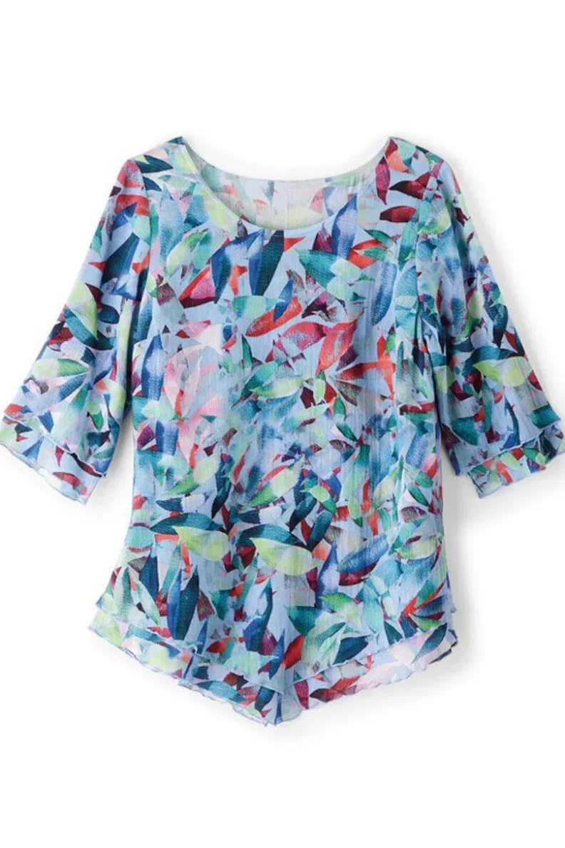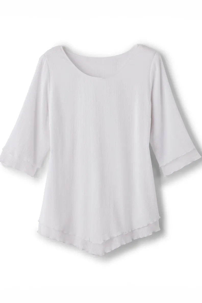 A beloved Soft favorite, in a new range of hues. Double layers of cotton come together to create one fantastic top with a chic lettuce edge on the 3/4 sleeves and pointed bottom hem. Scoop neck.