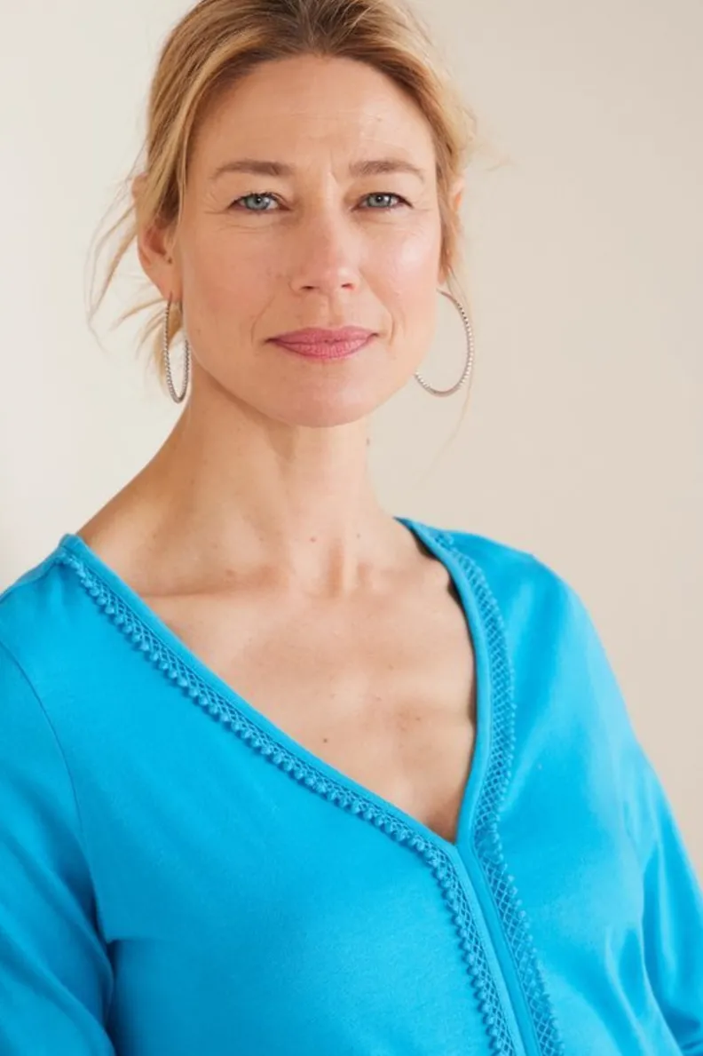 This soft, smooth knit tee is better than basic thanks to the lovely lace trim along the V-neck, center front and 3/4-length sleeve openings. That little added touch truly sets it apart from your everyday tee.